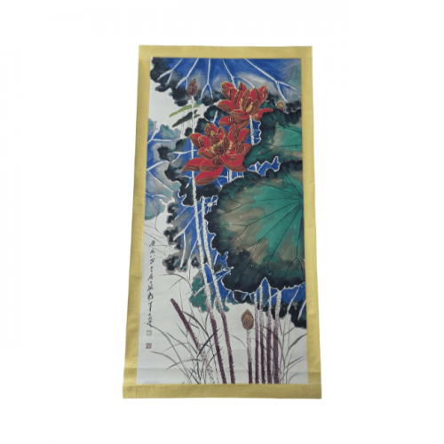 整幅画作采用竖幅全景式构图,以两朵盛放的金线红荷为视觉核心,荷叶以泼彩技法铺陈,荷茎挺拔贯穿画面,下方以写意蒲草收束,形成 “上密下疏、主次分明” 的视觉节奏。