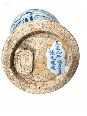 这件梅瓶最具价值、最稀缺的核心,便是底足的青花楷书款识:“至正八年六月吉日 张文进造”。