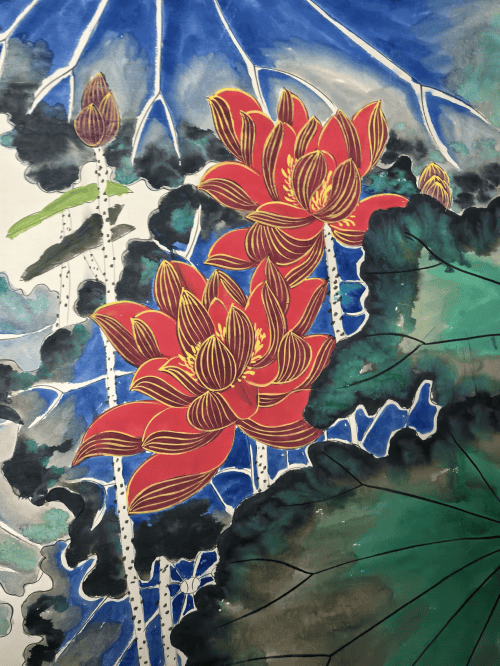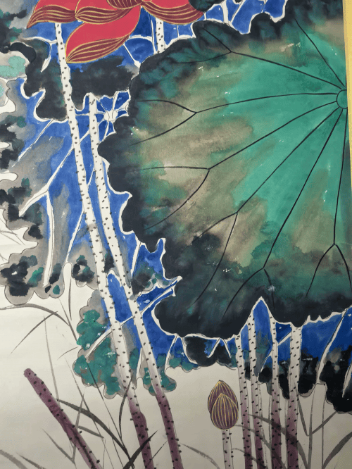 主体红荷占据画面上半部分,以浓艳朱砂绘就,金线勾勒花瓣脉络,在泼彩荷叶的衬托下,如同 “破壁而出”,极具视觉冲击力;
